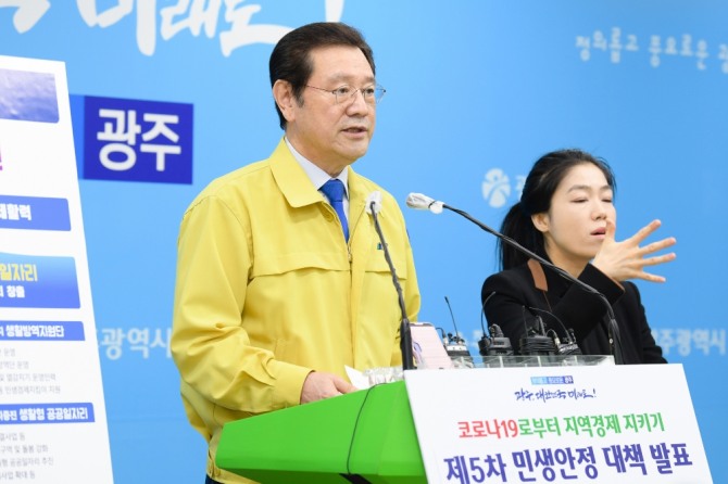 이용섭 광주광역시장은 8일 오전 시청 중회의실에서 제2차 광주비상경제대책회의를 열어 공공부문 시민일자리 채용 대책을 협의하고, 이날 오후 시청 브리핑룸에서 ‘코로나19로부터 지역경제지키기 제5차 민생안정대책’을 발표했다.