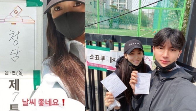 검은색 마스크에 모자를 쓴 김희선은 서울 청담동 제7투표소 옆에서 인증샷을 남겼다.