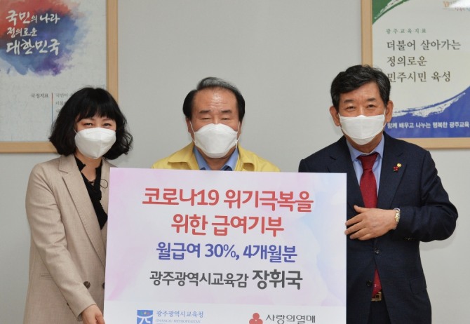 이미지 확대보기장휘국 교육감은 코로나19로 어려움을 겪고 있는 광주시민‧학생들의 고통을 함께 나누기 위해 이달부터 4개월 간 급여의 30%를 기부한다. 기부금은 재난 취약계층 지원을 위해 관내 지역아동센터의 방역, 위생용품 구입 등에 사용될 예정이다.