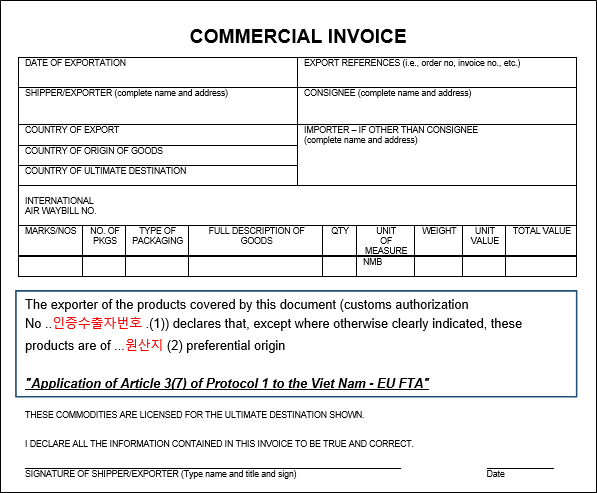 한-EU FTA 교차 누적 EU-베트남 원산지증명서 샘플