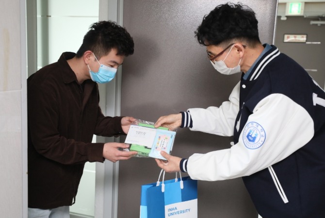 인하대는 지난 2월 외국인 학생들이 입국을 시작한 시점부터 지금까지 인천시 등 지역과 협력해 외국인 학생들을 적극 돕고 있다. 전 세계 코로나19 확진자가 급증한 지난달에는 시 미추홀구 보건소, 시 보건환경연구원과 함께 입국 뒤 자가격리 중인 이들을 대상으로 코로나19 검사를 실시했다. 또 최근까지 외국인 학생들이 마스크 구입에 어려움을 겪자 시가 나서 마스크 1만 장을 기증하기도 했다. 키트에도 기증한 마스크가 담겼다.