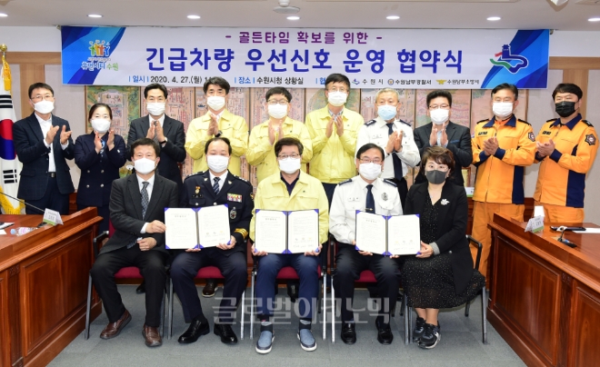 수원시와 수원남부경찰서, 수원남부소방서는 27일 수원시청 상황실에서 ‘응급환자 골든타임 확보를 위한 긴급차량 우선 신호 운영 협약’을 체결하고, 긴급차량 우선 신호 시스템이 원활하게 운영될 수 있도록 적극적으로 협력하기로 했다.