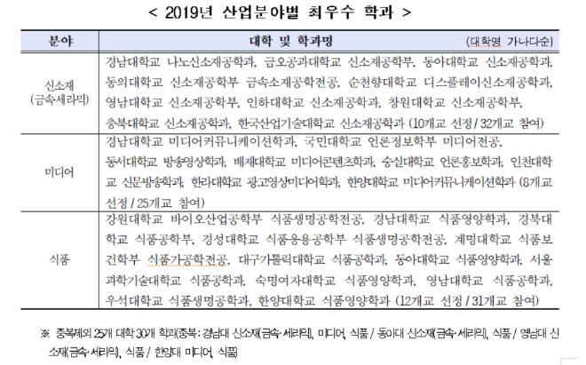 2019년 산업계관점 대학평가는 신소재(금속·세라믹), 미디어, 식품 등 3개 분야 관련 학과가 설치된 대학 중 참여를 희망한 62개 대학의 88개 학과를 대상으로 실시하였다. 평가 결과 25개 대학, 30개 학과가 최우수로 선정되었으며 명단은 다음과 같다.