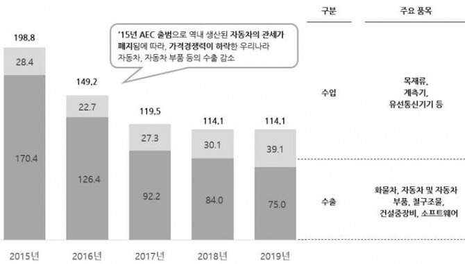 한국의 대라오스 수출은 최근 5년간 지속적으로 악화되고 있다. 2015~2019년 수출은 1억7000만 달러에서 7500만 달러로 55.9% 이상 수출이 감소했다. 이는 대라오스 최대 수출 품목인 자동차와 자동차 부품의 판매 부진에 기인한다.