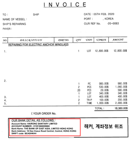 A1) 지난 2월 독일 선사에 선박 유지보수 서비스를 제공하고 인보이스를 이메일로 송부했습니다. 예상했던 것보다 송금이 늦어져서 처음에는 "독일 업체가 바쁘니까 그럴 수도 있겠지"라고 생각하다가 점차 걱정돼 3월에 송금 여부를 문의했습니다. 그런데 독일 선사가 "귀사가 변경 사실을 고지한 계좌로 이미 송금했다"라고 말하는 겁니다. 독일 선사가 보내준 인보이스와 송금증을 받아보니 우리 회사 계좌가 홍콩 계좌로 바뀐 것을 보고 가슴이 철렁했지요.