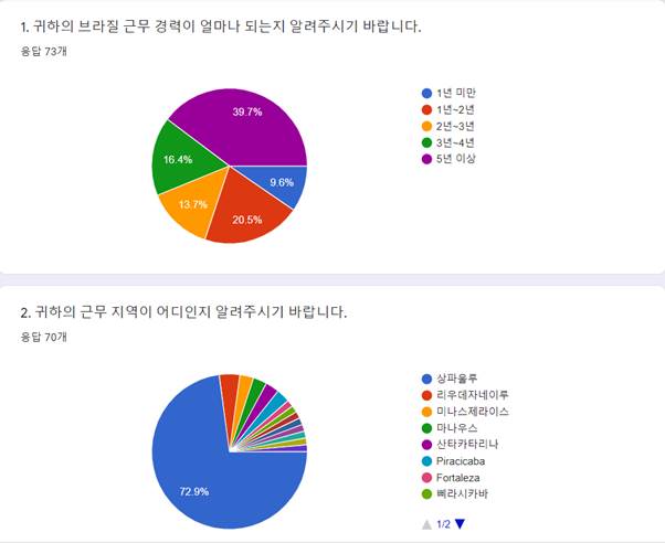 응답자의 39.7%가 브라질에서 5년 이상의 근무 경력을 지니고 있으며, 72.9% 이상이 상파울루주에서 근무하고 있는 것으로 나타났다. 상파울루주는 인구 4600만 명을 지닌 브라질 경제 중심지로 브라질 전체 GDP의 약 3분의 1을 차지하는 경제 중심지다. 브라질에 진출한 대부분의 한국 기업들이 상파울루주에 위치해있고 소수의 기업이 브라질 북부 아마조나스주(Amazonas)에 위치한 마나우스시, 남부에 위치한 산타카라티리나주, 북동부에 위치한 쎄아라(Ceara)주의 포르탈레자(Fortaleza)시 등에 진출해있다.