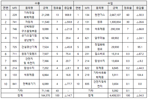 | 1 | 2711 | 천연가스 (Petroleum Gases And Other Gaseous Hydrocarbons) | 17,246 | 64% | △26% |
