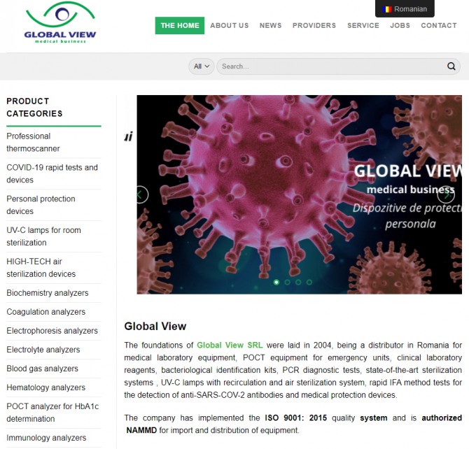 Global View(www.globalview.com.ro)는 의료 실험실 장비, 응급 장치용 장비, 임상 실험실 시약, 세균 식별 키트, PCR 진단 테스트, 멸균 시스템, 공기 재순환 및 멸균 시스템이 있는 UV-C램프, IFA의 사스-COV2 항체 검출에 대한 신속 진단테스트 그리고 의료 보호 장치의 수입업체 및 유통업체로서 2004년에 설립됐다.