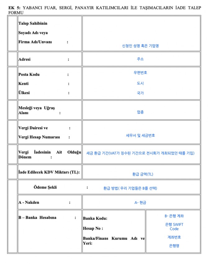 이 조항에 따라 준비해야 하는 서류는 아래와 같다. ・ 부가가치세 환급 신청서 ・ 제3자를 통해 신청할 경우 위임장 및 공증, 아포스티유 확인 필요 ・ 전시회에 참가신청해 참가했던 당사자의 여권과 번역본 공증 및 아포스티유 확인 ・ 본국의 사업자번호 확인 증서 ・ 전시회 참가비 증빙 영수증 혹은 공증 사본 터키 부가가치세 환급 신청서 자료: 터키 수익관리국 위 서류들을 준비해 전시회 주관 업체에 문의하면 주관업체가 등록돼 있는 세무서에 환급 신청을 할 수 있다. 많은 한국 업체들이 터키의 조세법에 대해 모르고 터키어로 돼있다보니 어려움을 느끼는데 많은 기업들이 이 정보를 활용하고 한국과 터키의 교역이 활발해지는 데에 도움이 되길 바란다. |