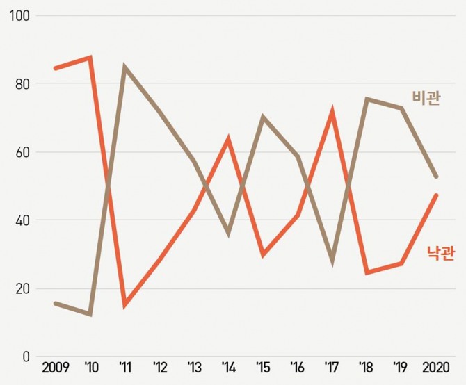 주: 2020년은 2021년 세계경기를 어떻게 전망하는지를 나타냄