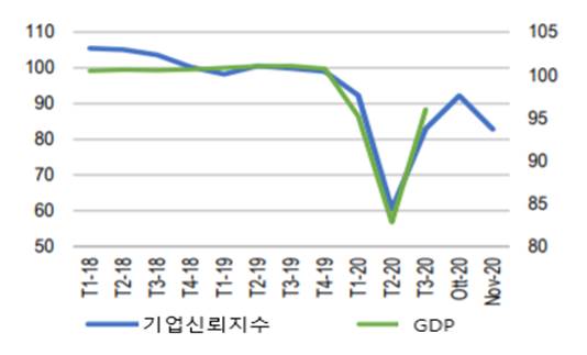그러나 11월 이후 코로나19의 재확산으로 인해 4분기는 다시 역성장을 기록한 것으로 예측되고 있다. 이러한 부분은 기업신뢰지수에도 영향을 미쳐 2분기 이후 회복세를 보이던 기업신뢰지수는 2020년 10월을 기점으로 다시 마이너스로 전환됐으며, 4분기에 이어 2021년도에서 코로나19로 인한 경제적 여파는 당분간 지속될 것으로 보이고 있다.