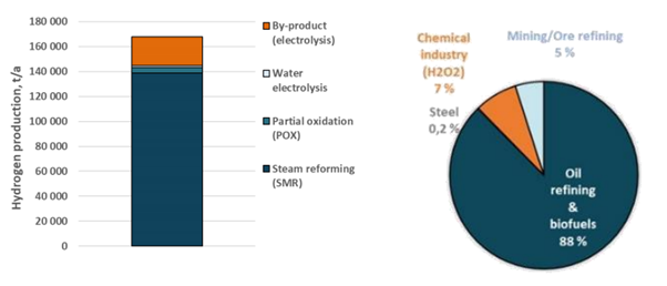 핀란드의 연간 수소 생산 및 소비량은 15만 톤 정도이다. SMR(steam reforming)이나 POX(Partial oxidation) 방식을 이용해 생산하는 수소가 대부분이다. 산업별 용도를 살펴보면 Oil refining & Biofuels 분야가 88%로 높은 비중을 차지하며, 다음으로 화학, 니켈, 코발트 등 제련과정에서 사용하는 비율이 많은 편이다.