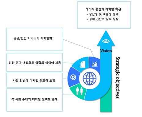 디지털 경제 전환 전략의 주요 비전은 데이터를 중심으로 한 혁신 사회이다. 디지털 인프라 도입, 민간/정부 서비스의 디지털화, 경제 분야에 양질의 데이터 제공, 각 사회 주체의 디지털 참여 확대를 일차적인 목표로 한다. 이를 통해, 궁극적으로 데이터 중심의 디지털 혁신을 장려하는 한편 경제 각 분야의 효율성과 생산성을 높이는 질적 성장을 주된 목표로 하고 있다.