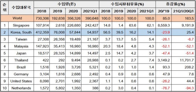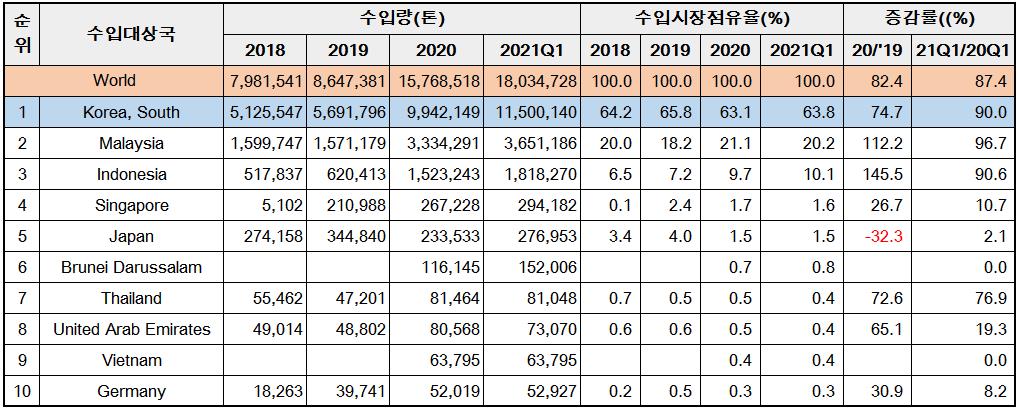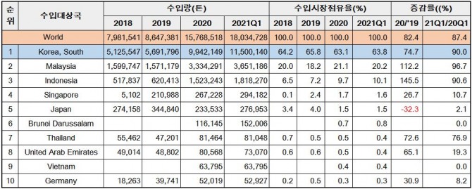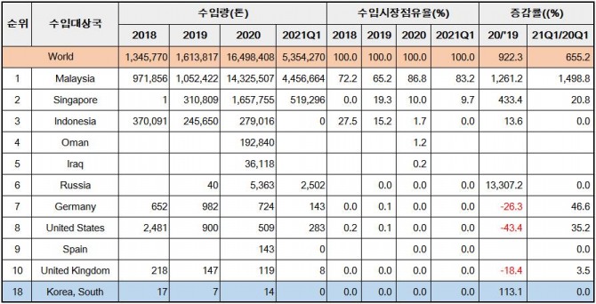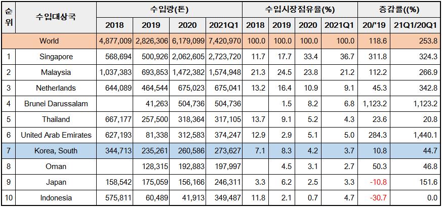 2020년 수입량이 전년대비 118.6% 급증한데 이어 올 1분기 전년 동기 대비 253.8% 증가했다. 세자릿 수의 급증세를 유지하고 있을 뿐만 아니라 증가 폭이 확대되고 있다. 지난 3개월간의 수입량은 742만 톤, 작년 1년간의 수입량을 웃도는 수준이다.