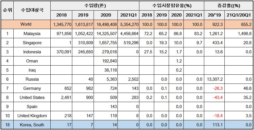 해당 품목의 2020년 수입금액은 전년 대비 3.5% 소폭 증가한 1억5000만 달러, 이중 대한국 수입은 2728만 달러로 전년대비 45.2% 감소했다.