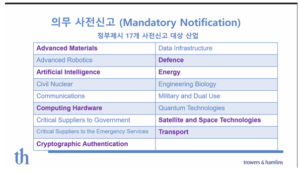 영국에 투자하려는 우리 기업은 해당 산업이 17개의 사전 신고 대상인지 파악을 해야 한다. 일부 산업의 경우 자세한 심사 대상 가이드라인이 제시되어 있으므로 이를 사전에 확인할 필요가 있다. 예를 들어 수송산업의 경우 연간 100만톤 이상의 화물을 다루는 항구·항만이나 연간 600만 이상 여객 이용 또는 10만 톤 이상의 화물을 다루는 공항이 이에 해당된다. 컴퓨팅 하드웨어의 경우, 규모에 상관없이 중앙처리장치(CPU)를 취급하는 모든 사업체가 해당된다.