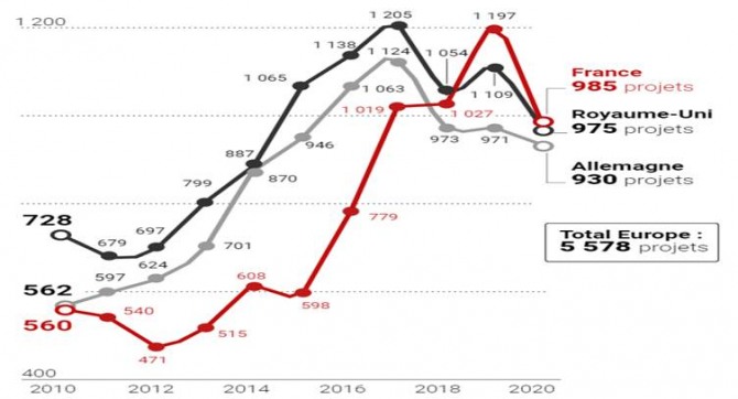 조사전문기업 EY에 따르면, 프랑스는 2019년 유럽에서 가장 많은 해외 투자 프로젝트를 유치한 국가였다. 이후 브렉시트가 시작되고 코로나19로 경제가 마비됐던 2020년에도 프랑스가 해외투자자들에게 같은 매력을 어필할 수 있을지 관심이 집중돼 왔다. 지난 6월 7일 EY가 발표한 자료에 따르면, 2020년 프랑스가 유치한 해외투자 프로젝트는 영국(975건), 독일(930건)보다 많은 985건으로, 프랑스는 2년 연속 유럽 제1의 해외 투자유치국이 됐다.