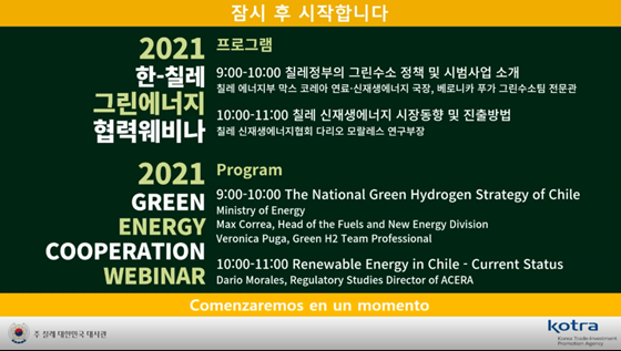 | 연사 | 장근호 대사(주 칠레 대한민국 대사관) Veronica Puga(칠레 에너지부 그린에너지 전문관) Dario Morales(칠레 신재생 에너지 협회 ACERA 연구부장) |