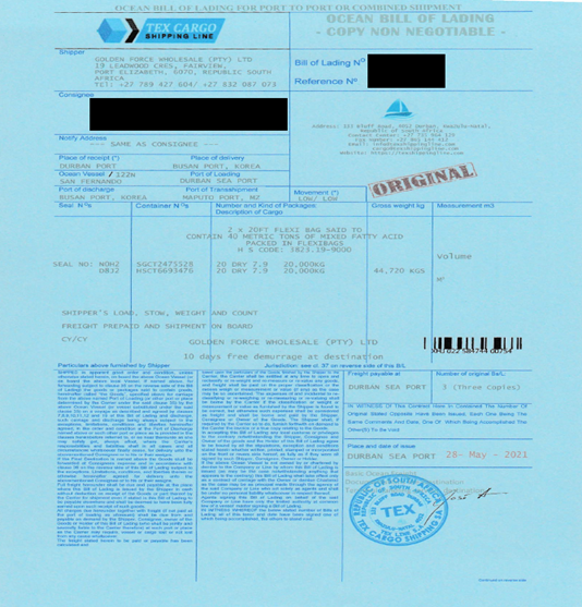 | Q. 현지 업체는 어떻게 알게 되었나요? A. 공급업체 주선 에이전트를 통해 남아공 공급업체를 소개받았습니다. 해당 에이전트는 예전부터 믿을 수 있는 공급업체를 소개해주고 있어 에이전트들도 남아공 업체를 사기가 아닌 진성 업체로 여기고 소개해준 것으로 생각됩니다. Q. 자세한 경위와 피해 사실을 말씀 부탁드립니다. A. 남아공 Port Elizabeth 소재 Golden Force Wholesale Pty Ltd라는 업체로부터 식물성유지인 Mixed Fatty Acid 수입을 진행 중에 선적서류 위조에 의한 무역 사기를 당했습니다. 계약서 서명 후 선수금과 중도금으로 6,000달러를 송금했고 이후 수출업체와 House B/L을 발행한 포워딩업체와의 연락이 두절되었습니다. Q. 사기 업체라고 생각하기 어려웠던 이유가 있으신가요? A. 사기 업체들은 그럴듯한 홈페이지와 회사 등록, 세금 관련 문서들을 보유하고 있었습니다. 심지어 Golden Force Wholesale Pty Ltd라는 업체는 가짜 포워딩 회사인 TEX Cargo Shipping Line(https://texshippingline.com)이라는 업체의 웹사이트까지 완벽하게 구축하고 있어서 위조된 B/L 번호를 입력하면 해당 컨테이너가 정상적으로 booking이 완료된 것으로 조회되는 교묘한 수법을 사용하고 있어 더욱 의심하기 어려웠습니다. |