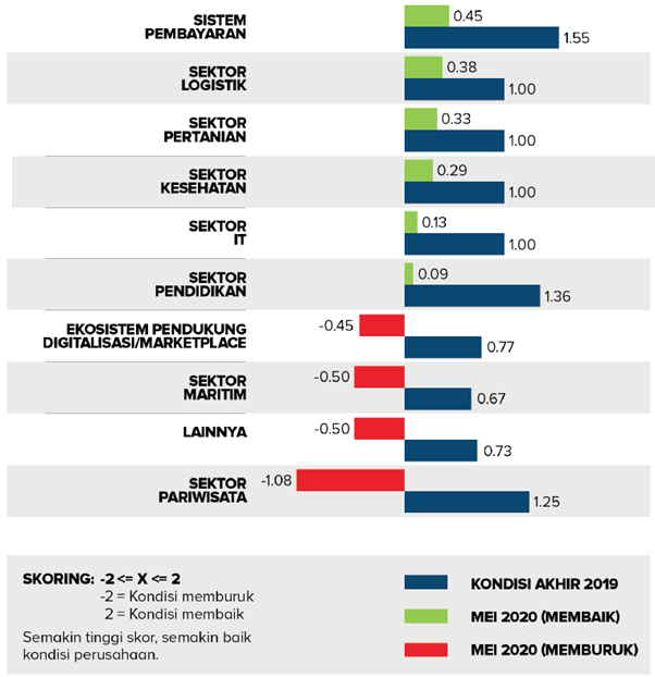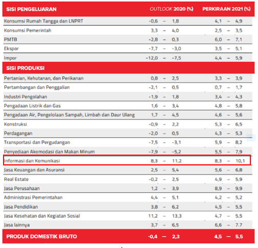약 3,000 개 글로벌 기업에 대한 S & P 보고서에 따르면 Covid-19 대유행이 정보통신 산업에 미치는 영향은 금융 및 항공 산업 등과 비교할 때 미미하다. 오히려 Covid-19은 소비자들의 행동을 변화시키고 디지털 기술의 사용을 증가시키는 등 긍정적인 영향을 주고 있다. 집에서 일하고 공부하는 습관들은 데이터 트래픽의 소비를 크게 증가시켰다. 또한 이러닝, 전자결제, 전자정부 및 전자상거래와 같은 다른 부문도 점점 더 수요가 증가하고 있다. 이에 따라 2021년 통신 산업은 인도네시아 국가 경제 성장에 크게 영향을 미칠 것이다. 인도네시아 재무부와 개발기획부 (Bappenas)는 인도네시아의 정보통신 산업이 2021년에 8.3~10.1% 정도 성장할 것으로 전망하고 있다.
