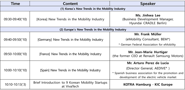 1일차 모빌리티 시장동향 웨비나에서는 한국 및 유럽 자동차산업 주요 3개국의 연사가 발표하였다. 현대차그룹의 오픈 이노베이션 센터인 현대 크래들 베를린은 인공지능, 자율주행, 스마트시티, 로봇기술 등 유망기술을 개발하는 스타트업들과의 협력 동향에 대해 발표했으며 독일, 프랑스 및 스페인의 모빌리티 전문가들이 웨비나 참가자들에게 전기 모빌리티 등 각국의 최신 모빌리티 시장동향을 전했다.