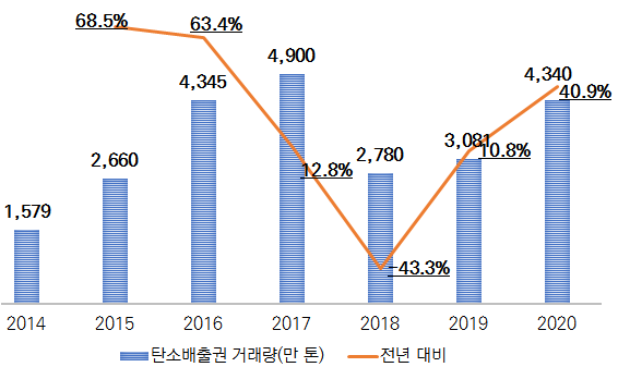 중국 주요 탄소배출권 거래소의 거래액은 2017~2018년 2년 연속 마이너스 행진을 이어오다가 2019년부터 2년간 두자릿수 성장세를 보이고 있다. 2020년은 전년대비 33.5% 증가한 12억7000만 위안으로 기록을 갱신했다.
