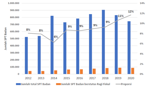 주: 왼쪽 축(총 법인세 신고서 제출건수), 오른쪽 축(적자를 기록한 법인 비율)
