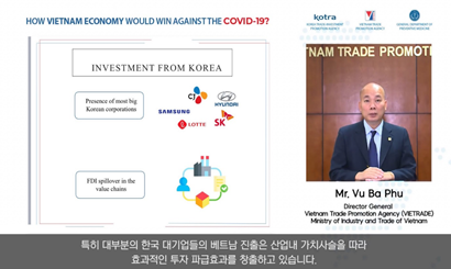 | 일시: 2021년 8월 4일(수) 08:00 ~ 10:00(베트남 시간), 10:00 ~ 12:00(한국 시간) 주최: KOTRA(KOTRA), 베트남 무역진흥청(VIETRADE), 베트남 보건부 예방의학청 대상: 베트남 주재 한국 기업 대표 약 200여 명 장소: Zoom 온라인 송출 주요 연사: 베트남 정부, WHO 베트남 사무소, 베트남 성정부 관계자 등 주요 내용 : 베트남 정부의 코로나 위기 대응전략, 코로나의 영향과 파급효과,성공적인 코로나 위기 대응사례 등 |