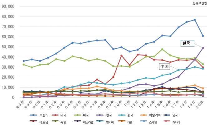 일본의 화장품류 대한국 수입액은 꾸준히 증가 추이를 나타내고 있다. 2019년 약 450만 달러로 제4위 수입상대국에서 2020년에는 약 550만 달러로 제2위 수입상대국으로 한국의 존재감이 높아지고 있다.