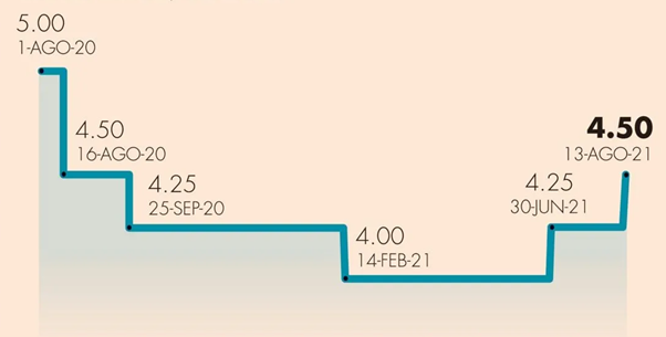 2020년 8월부터 2021년 8월까지 멕시코 중앙은행은 여러 차례의 기준 금리 인하와 인상을 반복했다. 그 결과 2021년 8월 기준 금리는 4.5%에 도달했다. 멕시코 중앙은행은 팬데믹으로 멕시코 경제 성장 전망이 불투명한 점을 들어 2020년 8월부터 꾸준히 금리 인하를 단행했다. 해당 조치는 내수 활성화와 투자 유치를 통한 경기 부양 목적인 것으로 분석된다.