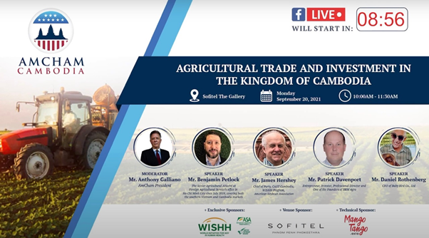 미국상공회의소(AmCham Cambodia)는 2021.9.20(월)에 캄보디아 농업 무역 및 투자관련 웨비나(Agricultural trade and investment in the kingdom of Cambodia)를 개최하였다. 캄보디아 AmCham 회장인 Mr. Anthony Galiano가 사회를, Foreign Agricultural service’s office의 Mr. Benjamin Petlock, 농업관련 NGO인 CAST Cambodia의 Mr. James Hershey, BRM Agro社의 Mr. Patrick Davenport, Baby bird社의 Mr. Daniel Rothenberg가 발표자로 참여했다. 캄보디아에서 농업은 GDP의 23%를 차지하며 전체 노동인구의 32%가 참여하고 있는 주요 산업분야이다. 코로나19로 봉제산업이 타격을 받은 가운데, 봉제산업 실업자가 농업으로 이동하면서 농업의 중요성이 확대되고 있다.