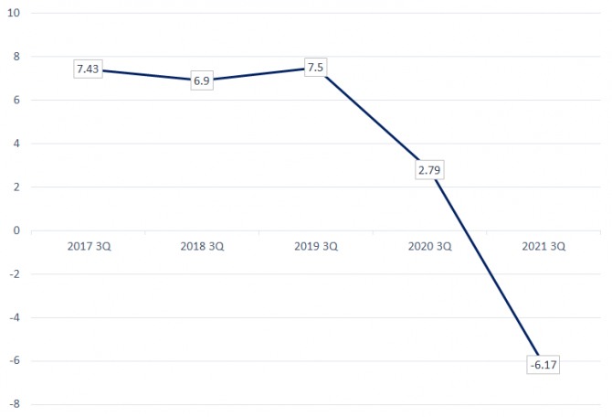 3분기 경제성장률이 역대 최저치를 기록함에 따라 2021년 1~9월의 성장률 역시 작년보다도 낮은 수치인 1.42%를 달성하게 됐고, 건설업(-5.02%), 서비스업(-9.28%) 등의 생산 지수도 감소했다.