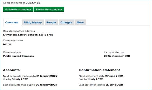 회사 이름이나 번호로 검색을 하면 아래와 같은 화면을 볼 수 있다. 화면에서는 회사이름이 가장 큰 글자로 나오고 회사이름 밑에 회사번호(Company number)가 표시돼 있다. 밑에 보면 Overview, Filling history, People, Charges, More와 같은 탭이 있다. 기업 정보 확인 시 주로 사용하는 탭은 Overview, Filling history, People 등 3개이다. Overview 탭을 클릭하면 회사의 등록주소(Registered office address), 현상태(Company status), 회사 종류(Company type), 설립연월일(Incorporated on), 업종(Nature of business), 과거 회사 이름(Previous company names) 등을 확인할 수 있다.