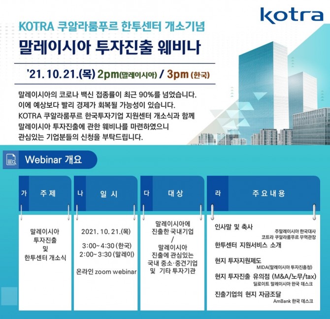 지난 10월 20일 KOTRA 쿠알라룸푸르 무역관에서 개최된 한국투자기업지원센터 (한투센터) 개소기념 웨비나를 통해 투자진출 기업 대상으로 지원서비스 소개 및 말레이시아 현지진출(M&A) 경영지원에 대한 온라인 웨비나가 개최됐다. 이번 웨비나는 KOTRA 쿠알라룸푸르 무역관에서 개소식 기념으로 말레이시아 진출 희망 기업 대상 센터 소개 및 다양한 지원제도를 안내하고자 개최하였다. 웨비나에 앞서 주 말레이시아 한국 대사, MIDA 부사장 등이 개소 축하를 위해 참여하였으며, 온라인 웨비나 연사자로는 MIDA, 딜로이트 말레이시아, AM Bank 관계자 분들이 연사로 참여했다.