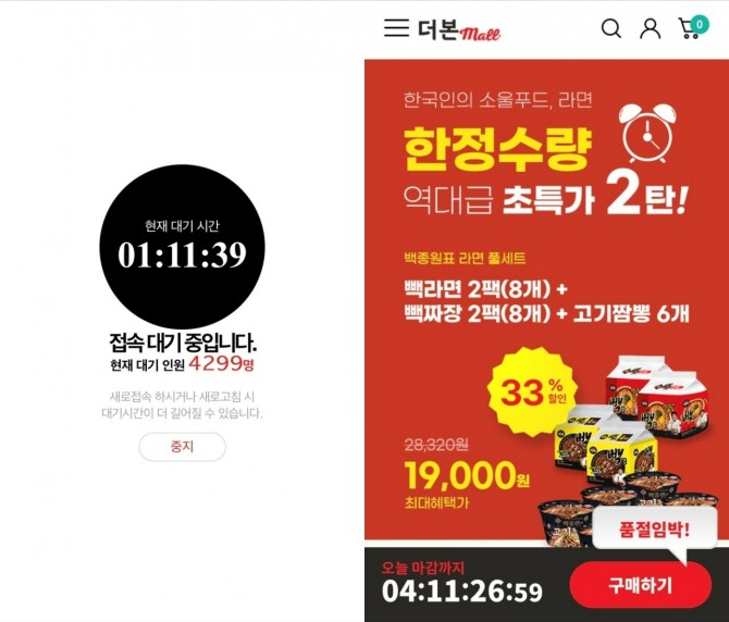 얼마 안 있어 ‘더본몰’ 링크가 올라왔다. 평소 라면을 즐겨 먹기에 고민도 하지 않고 링크를 눌렀다. 18시 52분, 핸드폰 화면에 찍힌 대기 인원은 4299명이었다. 대기 시간은 1시간 11분 39초로 나타났다. 기다려 보기로 했다.