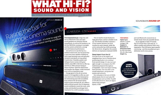 이미지 확대보기영국의 대표적인 AV(오디오ㆍ비디오) 전문지 ‘왓 하이파이(What HiFi? Sound and Vision)’ 1월호는 ‘사운드바 대결 (Soundbars Round-up)’ 특집에서 LG 사운드바(모델명 NB3520A)를 최고제품으로 선정했다.