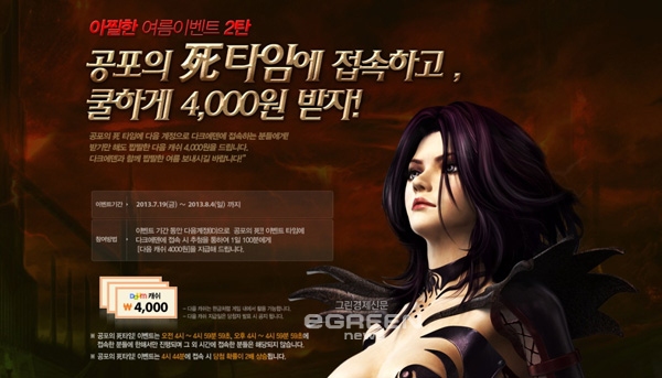 [글로벌이코노믹=노진우기자] 다음커뮤니케이션은 소프톤엔터테인먼트(대표 유태호)에서 개발하고 자사가 채널링하는 정통 호러 액션 MMORPG ‘다크에덴’의 여름맞이 이벤트를 진행한다.‘호러 게임’에 걸맞게 여름의 더위를 식혀줄 이번 이벤트는 모두 3가지로 나눠 진행된다. 우선 8월 7일까지 다음 계정으로 ‘다크에덴’에 접속하면 보기만 해도 시원한 아이스큐브를 전원 지급한다.
