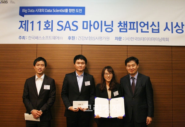 [글로벌이코노믹=노진우기자] SAS(쌔스)코리아(대표 조성식)가 미래 빅데이터 전문가를 꿈꾸는 전국 200개팀 600여명의 대학생들이 참가, 열띤 경쟁 속에 진행된‘건강보험심사평가원과 함께하는 제11회 SAS 마이닝 챔피언십'의 결선을 26일 갖고, 수상자에 대한 시상식을 진행했다.올해 11회째를 맞이한 'SAS 마이닝 챔피언십'은 SAS코리아가 역량있는 분석 인재 발굴 및 분석가 저변 확대를 위해 매년 개최해 온 공모전으로, 최근 빅데이터 열풍과 함께 ‘데이터 사이언티스트’ 양성의 산실로 주목 받고 있다.