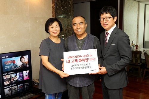 KT(회장 황창규)는 1일 셋톱형 UHD 서비스인 ‘olleh GiGA UHD tv’ (이하 올레 기가 UHD tv)의 1호 가입자를 유치했다고 발표했다.‘올레 기가 UHD tv’ 1호 가입자는 김포에 거주하는 김기웅(60세,남) 씨다. KT 미디어사업담당 전범석 상무는 1호 가입자인 김기웅 씨에게 프리미엄 사운드바와 유료 콘텐츠 이용권을 직접 전달했다.
