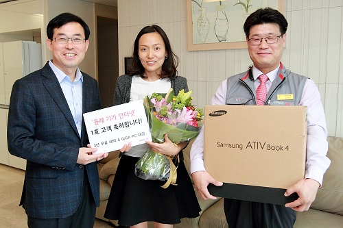 KT Customer부문 부산고객본부 이강근 본부장(사진 왼쪽)이 부산에 거주하는 한희(사진 중앙)씨에게 올레 기가 인터넷 1호 가입에 대한 보답으로 올레 기가 인터넷 3년 무료 이용 혜택권과 GiGA PC를 직접 전하고 있다.