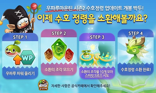 그 동안 베일에 가려져 있던 ‘수호정령’은 금일 업데이트된 숲의 정령 ‘다프네’를 필두로 다양한 속성의 정령들을 선보일 예정이며, 새로운 건물 ‘스피릿크로스’에서 우파루들의 조합에 정령석을 이용해 소환할 수 있다.