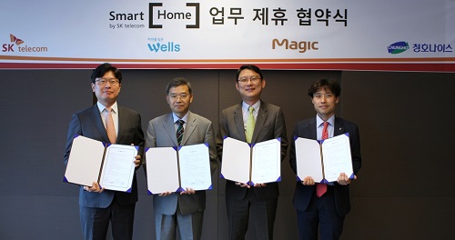[글로벌이코노믹 김수환 기자] SK텔레콤은 27일 서울 중구 SKT타워에서 국내 생활가전 렌탈 전문업체인 교원웰스·동양매직·청호나이스와 스마트홈 제품 공동 개발과 서비스 협력을 위한 양해각서(MoU)를 교환했다.