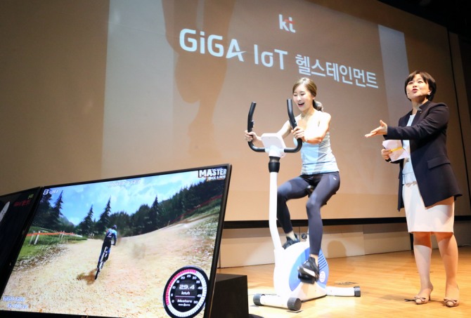 이미지 확대보기KT는 이날 행사에서 올레tv 가입자가 이용 가능한 ‘GiGA IoT 헬스밴드’ 외에도 곧 출시 예정인 ‘GiGA IoT 헬스바이크’, ‘GiGA IoT 헬스 골프퍼팅’ 서비스를 선보였다. KT는 올레tv에서 제공되는 운동프로그램 영상과 게임으로 재미요소를 반영해 타사와 차별화했다.