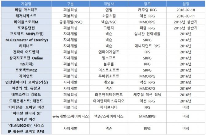 지난해 12월 클로즈드 베타 테스트를 진행 했으며, 2016년 정식 서비스를 진행할 예정이다. 이와 함께 언리얼 엔진 4를 사용해 레고(LEGO®) 시리즈 IP를 활용한 모바일 RPG를 개발 중이며 스퀘어에닉스와 MMMRPG(Massive Multiplayer Mobile Role Playing Game)를 표방하는 ‘파이널 판타지 XI’의 모바일 버전을 공동으로 개발하고 있다.