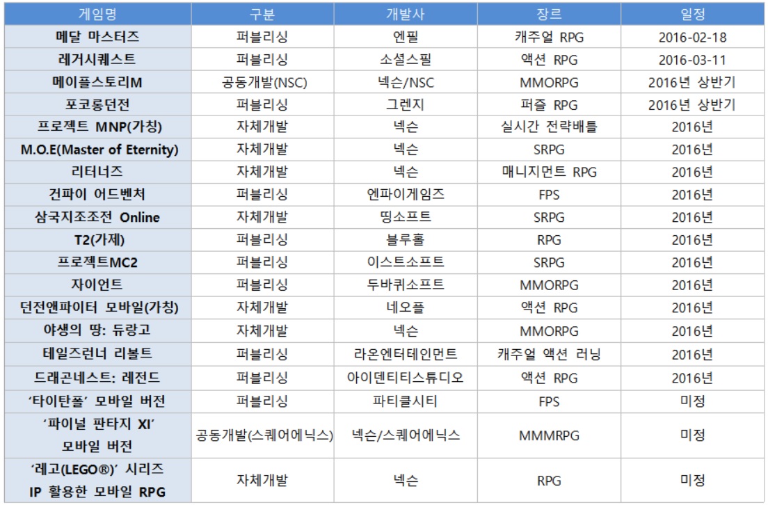 신규개발본부에서 개발 중인 ‘M.O.E(Master of Eternity, 마스터 오브 이터니티)’, ‘프로젝트 MNP’ 역시 2016년 선보일 예정이다. ‘M.O.E’는 미소녀와 메카닉을 소재로 한 모바일 SRPG로, 지난 해 지스타 현장에서 최초로 영상을 공개하며 게임 커뮤니티에서 화제를 모았다.