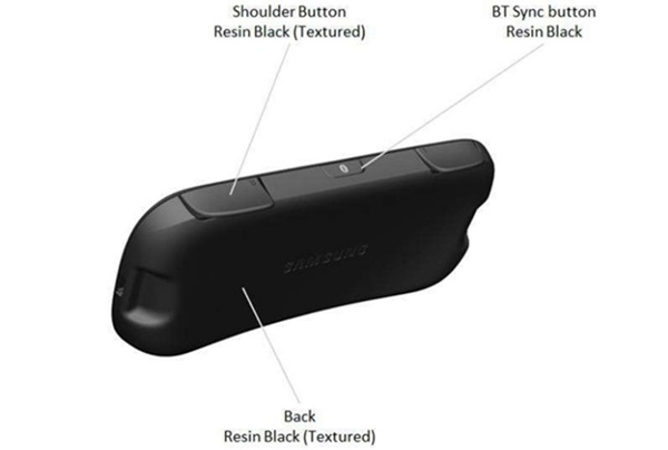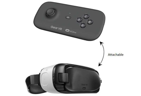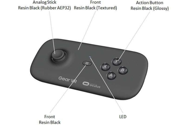 이 가상현실(VR)헤드셋용 무선 컨트롤러 전면 아래쪽에는 기어VR(GEAR VR), 그리고 제휴사 오큘러스(oculus)라는 글자가 선명하다. 겉에 써 있는 글자가 아니면 VR헤드셋용 컨트롤러인지 알기 어렵다. 오히려 2D게임용 컨트롤러와 매우 유사해 보인다.