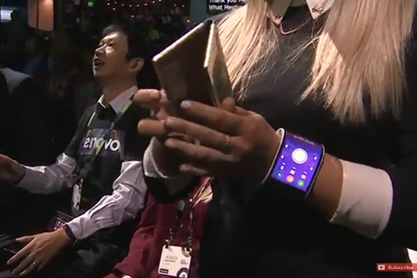 레노버는 이 날 행사장에 유튜브 스타 메건 맥카시를 관람석에 등장시켰다. 그녀는 들고 있던 스마트폰을 구부려서 팔찌처럼 왼팔에 착용하는 모습을 보여주었다. 주머니 없는 드레스를 입고 나온 그녀는 “그러면 스마트폰을 어디다 둘까요?”라고 물은 뒤 들고 있던 스마트폰을 구부려서 자신의 팔에 차고는 “팔에 찰 수 있다”고 말했다.