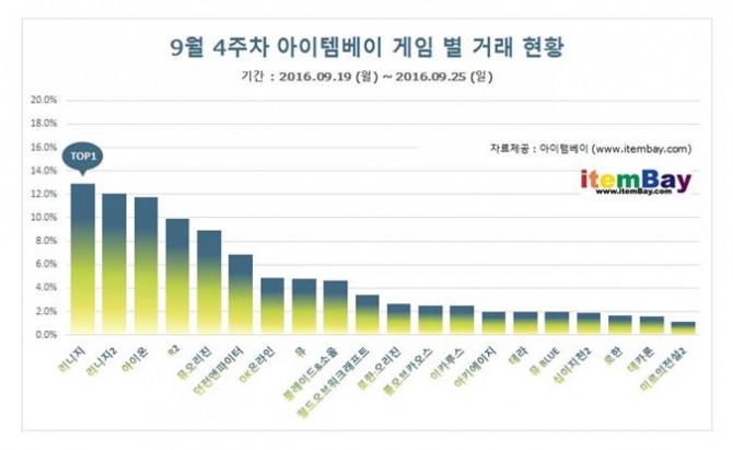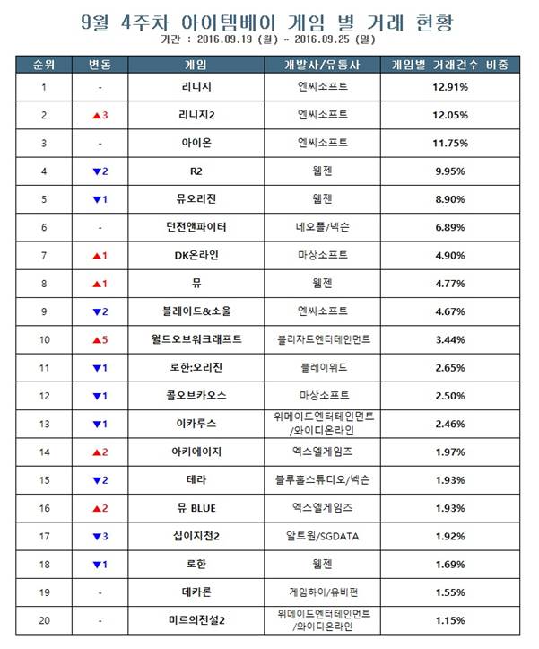 28일 아이템베이에 따르면 9월4주(9월 19일~9월 25일) 게임 아이템 거래 현황(거래 건 수 기준)을 조사한 결과 전주인 9월 3주에 2위로 급상승했던 웹젠의 R2가 4위로 하락한 상태에서 전주에 5위를 차지했던 리니지2가 2위로 급상승했다.