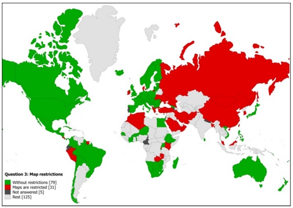 한편 UN세계지형공간정보운영위원회(UN-GGIM)와 국제사진측량 및 원격탐사학회(ISPRS)는 지난 해 전세계 193개 회원국가운데 115개국으로부터 지도제작 관련 설문 조사를 했다. 이에따르면 지난 해까지 전세계에서 지도반출을 제한하는 국가로 확인된 나라는 최소 16개국에 이른다. 여기에는 한국을 비롯하여, 싱가포르, 말레이시아, 중국, 몽골, 러시아, 덴마크, 아일랜드,그리스, 터키,이란, 코스타리카, 페루,아프가니스탄, 사우디아라비아, 오만, 모로코, 알제리, 튀니지, 케냐, 르완다, 잠비아, 부탄, 말레이시아, 브루나이, 수리남, 우크라이나 등이 있다.