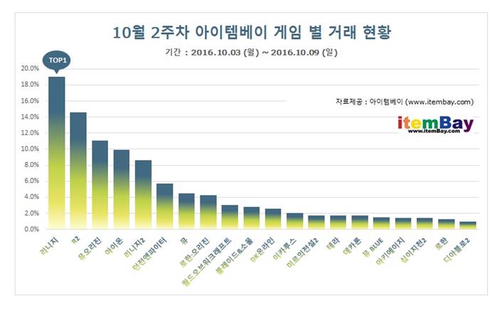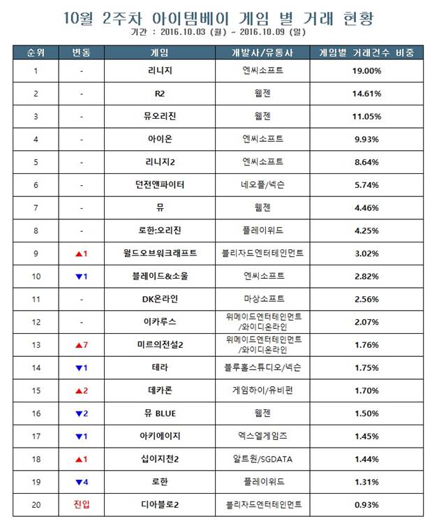 12일 아이템베이가 10월 2주(10월 3일~10월 9일)까지 게임아이템 거래 건수를 조사한 결과, 5위권 내 순위가 전주와 동일한 순위를 보인 것으로 파악됐다. 1위 리니지를 제외하고 지난달부터 4주 연속으로 5위권 순위 내 순위가 계속 바뀌면서 상위권 순위경쟁이 치열하게 벌어졌다.